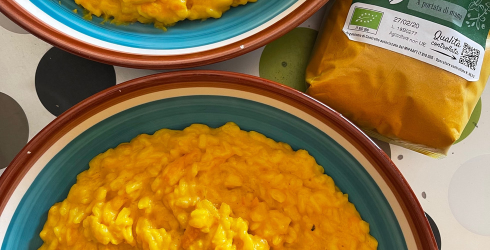 Il nostro risotto cotto nel latte vaccino arricchito con la curcuma, si sposa perfettamente con la crema di carote sia dal punto di vista cromatico che da quello nutrizionale.